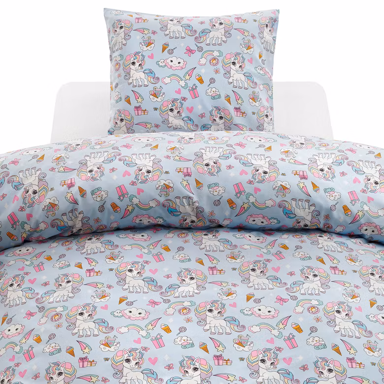Det charmiga mönstret av enhörningar, regnbågar och glassar på blå botten skapar ett glatt och harmoniskt sovrum, medan den mjuka bomullen gör nattsömnen extra skön.