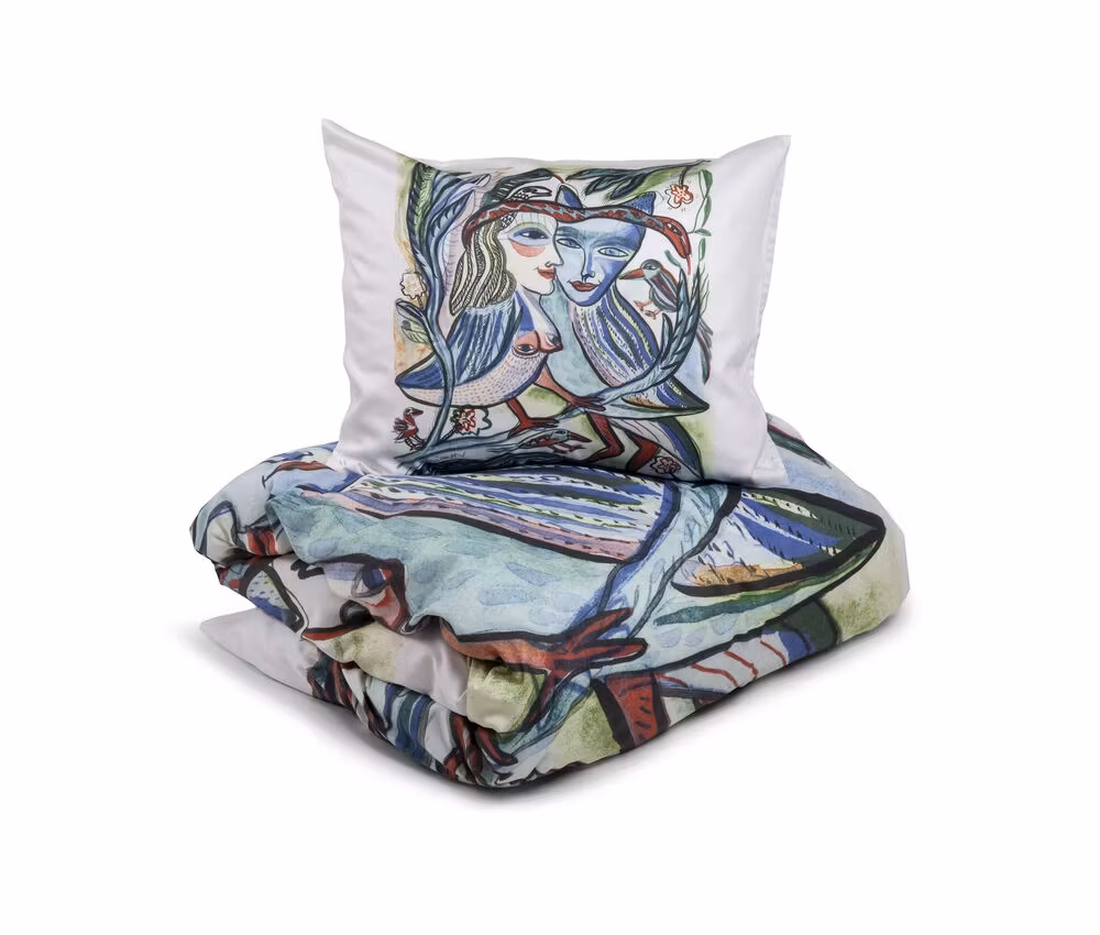 Konstnärligt bäddset i bomullssatin med färgstarkt motiv av Ulrica Hydman-Vallien. Len och sval kvalitet som gör sovrummet till ett levande konstgalleri.